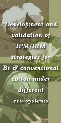 Cotton pest management has always been an immensely challenging task for entomologists all over the world. About 1326 species of insects have been reported on cotton worldwide (Matthews and Tunstall, 1994). World over, cotton crop suffers severe economic damage from several insect pests, most importantly the bollworms and sucking pests. Conventional insect pest control strategies rely heavily on insecticides. It is estimated that cotton cultivation consumes at least 10% of all insecticides used globally. Pesticides worth US $ 600 M are used annually in India for pest management, of which, nearly 50% of the total insecticides used are applied on cotton crop alone, which occupies only 5% of the total cropping area in the country. Over the past two decades, the perplexities in pest management intensified with more and more insect species developing resistance to insecticides. Cotton pest management was particularly affected due to insecticide resistance, which was a consequence of excessive use of insecticides on the crop. Cotton being a commercial crop was always subjected to intense human interventions so as to ensure maximum profitability. Insecticide resistance rendered insecticides ineffective, thus increasing the need for repeated applications, wastage of resources and consequent environmental pollution. Several efforts have been made all over the world to minimize crop losses due to major pests of cotton with focus on sustainable control of the bollworms. Insecticide use ranks the most significant amongst such interventions. All insecticides used for cotton pest management disrupt naturally occurring beneficial insect populations to variable extents. History shows that excessive and indiscriminate insecticide use representing ?exploitation phase' was invariably followed by ?crisis' and ?disaster' phases in cotton, thereby leading to problems of insecticide resistance, pest resurgence, accumulation of harmful residues and toxicity to non-target organisms. Subsequently non-insecticidal alternative methods of eco-friendly pest management are developed. Thus cotton IPM programmes were built around cultural control, biological control and bio-pesticide interventions in many parts of the world. Several efforts were made all over the world to devise region specific integrated pest management (IPM) systems. However, Poor efficacy of insecticides due to insecticide resistance in insects, and performance inconsistencies of bio-pesticides and biological control have been making IPM unsustainable. While new research projects have been formulated under the current TMC-MM-1 Programme to understand the emerging pests, identify eco-friendly pest management strategies, formulate sustainable IPM/IRM programmes and commercialize promising bio-pesticides, The 3.2 project aim at consolidating all results into location specific effective IPM strategies that can be implemented in farmer fields.
