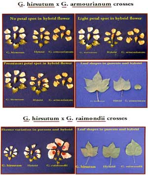 - Crosses were made between cultivated diploids, tetraploids and wild species to intorgress characters of fibre length, strength disease and pest resistance. The wild species utilized include G. anomalum, G.trilocum, G.bicki, G. nelsoni, G. thurberi, G. stocksii, G. capitis-viridum, G. aridum.
